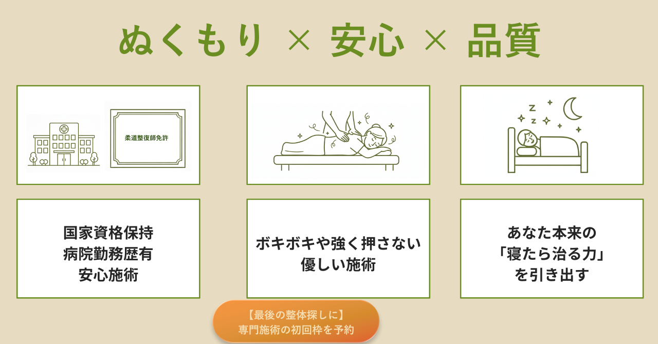 ・痛みだけでなく、めまい・動悸・倦怠感・自律神経の不調など慢性症状の根本改善と、日々の回復力(寝たら治る力)アップを目指します